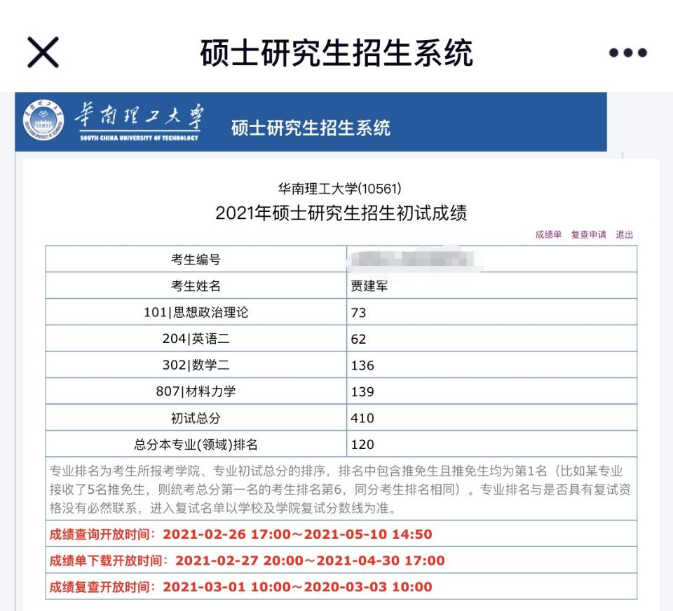 近日,威廉体育williamhill机械设计制造及其自动化专业的贾建军,收获了一份令他惊喜的好成绩:考研初试总分410分,复试表现突出,成功被华南理工大学机械与汽车工程公司机械工程专业录取!
