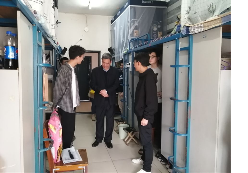在走访中,杨书记每到一间宿舍,都会与同学们亲切交谈,听取员工心声,针对同学们学业中存在的问题和疑惑进行指导。他鼓励同学们要明确目标,志存高远,继续发扬老一辈的艰苦奋斗、自强不息精神,坚定理想信念、锐意开拓进取,以实际行动向党的100周年献礼。